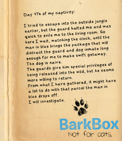 With such treachery, I took the idea of a cat keeping a diary of its "captivity," and rewrote it to show the perpetual angst they must feel of never experiencing the glory of a BarkBox.