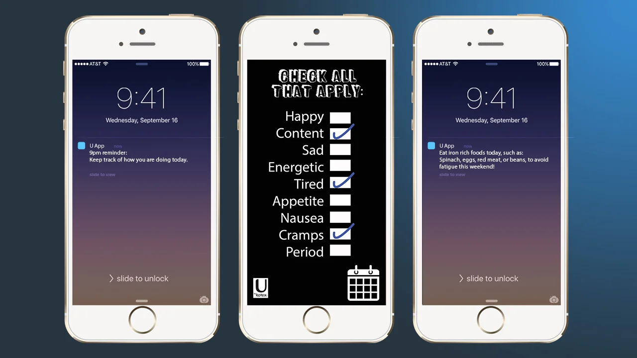 We designed an app called "U," that gathers information by asking a few short questions. It then can send you reminders leading up to the day of your period, suggesting things that could help you feel your best in the week to come.